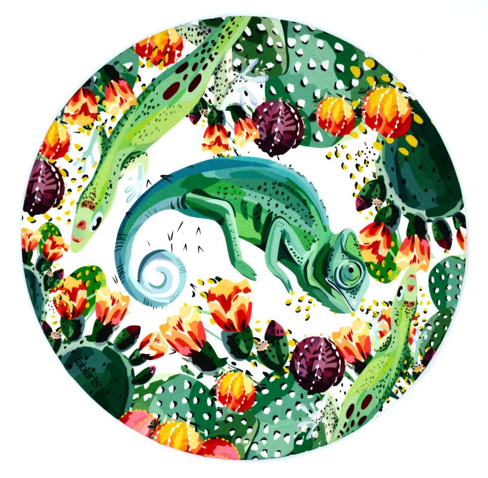 Wild and unique design. White background with green cactus, orange flowers, and reptiles. Surprise your guests with our Green Desert design. It´ll blow their minds.